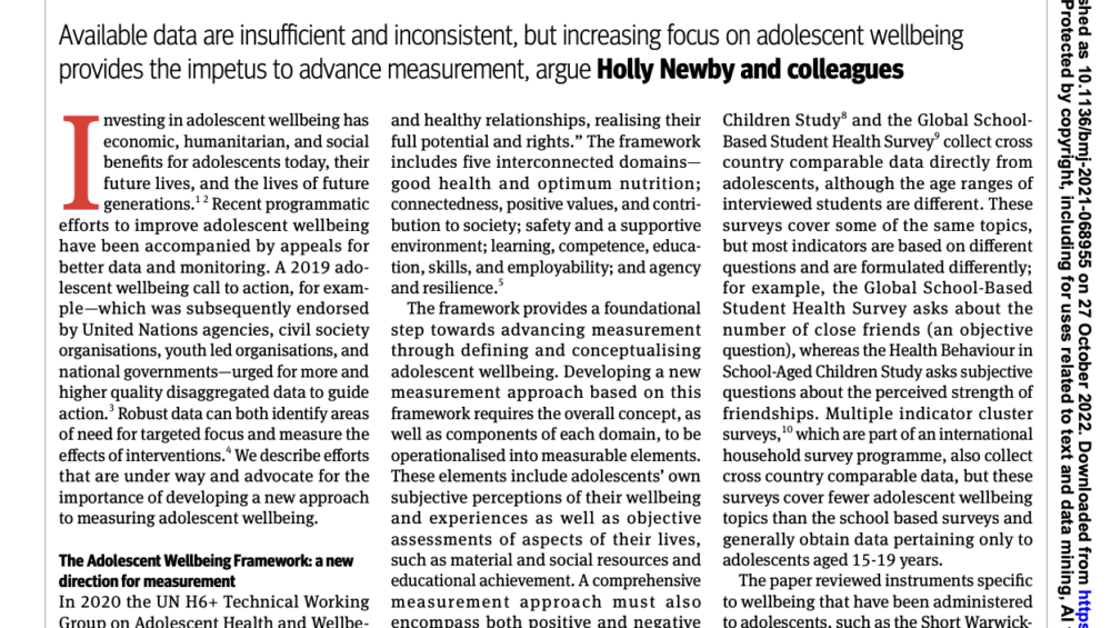CategoriesUncategorizedThis article examines the need for stronger, more comprehensive data to guide adolescent well-being interventions and policies. It introduces the Adolescent Wellbeing Framework, which covers five key domains: good health, connectedness, safety, learning, and agency. Current measurement tools are described as fragmented and inconsistent, often focusing on narrow aspects of well-being. The article calls for […]