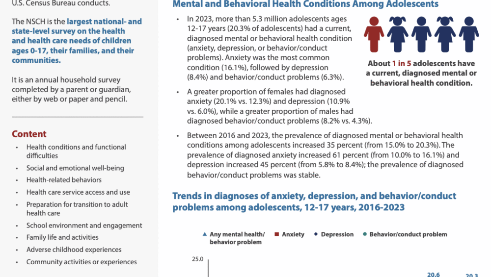The National Survey of Children’s Health (NSCH) School Readiness 2022 Data Brief provides insights into the school readiness of children aged 3-5, assessing five key domains: Early Learning Skills, Social-Emotional Development, Self-Regulation, Motor Development, and Health. The data reveals that 63.6% of children were “On Track” across these domains, highlighting the importance of school readiness […]